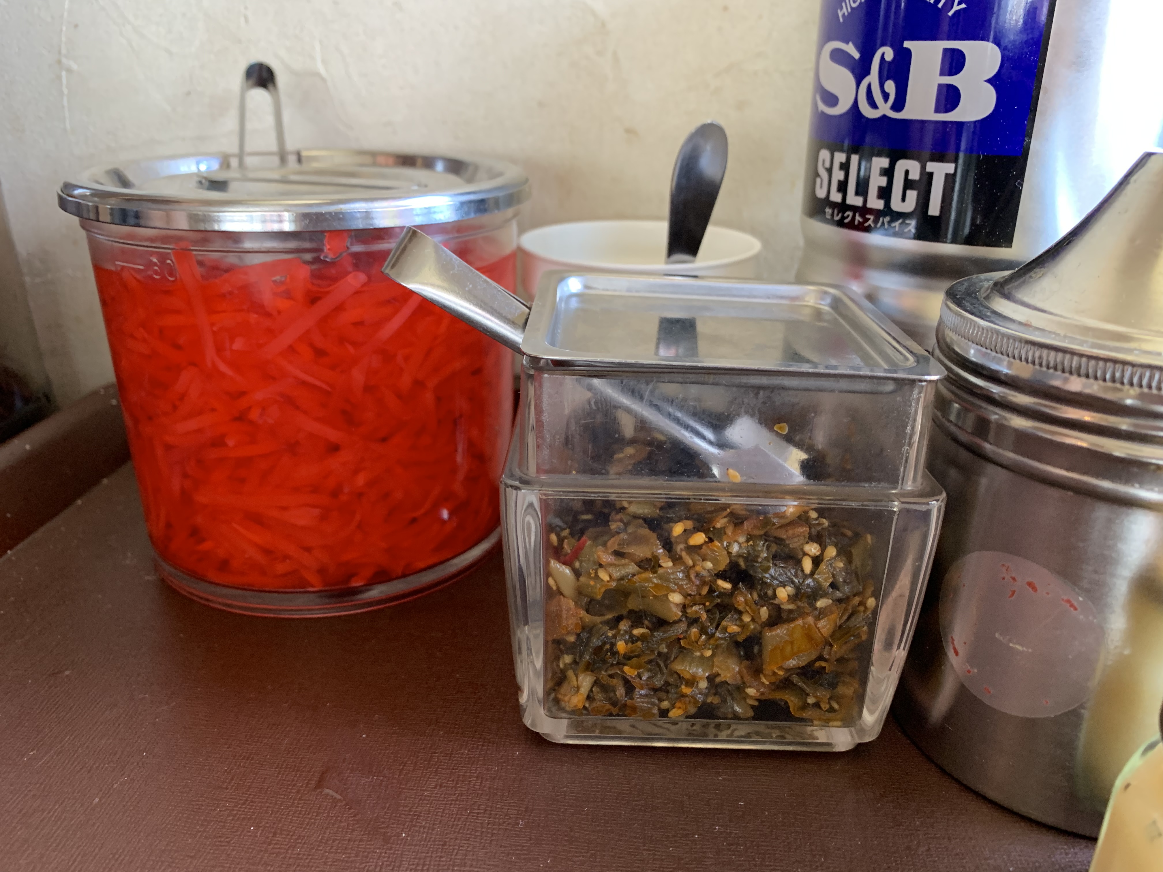 テーブルにはおなじみの高菜・紅生姜・すりごまがセットされています。
