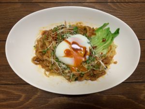 辛さを和らげる温玉とスプラウトとかのお野菜を少しプラスしてみたよ!